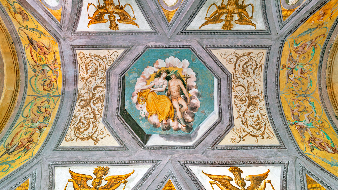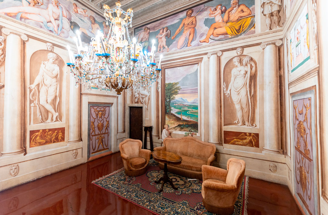 Inside the villa, the Pinacoteca Hall accommodates 250 guests at elegant round tables, while the Central Hall seats 100 guests. The nine frescoed halls provide unforgettable backdrops for your photo shoots and for your guestsâ visit.