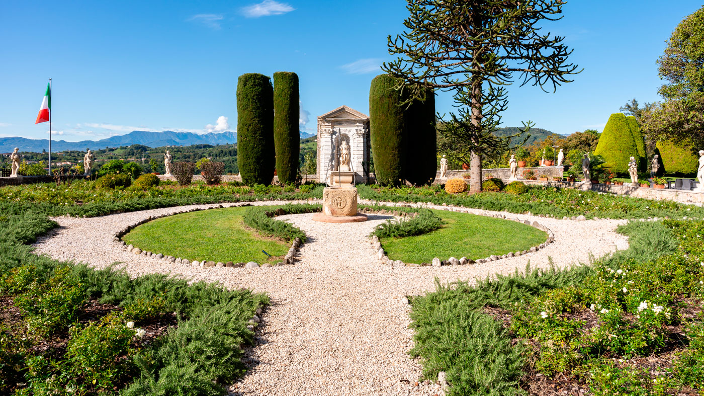 The secret garden of Villa Godi Malinverni, on the other hand, is certainly the work of Palladio himself, who created this space through a complex and effective system of terraces and retaining walls to manage the slope of the hill on which the villa was built. At the center of the garden is a well, while stairs run along the sides, leading to the hanging garden and the current park beneath a wisteria pergola. The last trace of Palladio's presence in Lonedo is found right here. The well's rim is made of stone from Monte Summano, and from the Prealps of Vicenza, it forms part of the horizon of Lugo, which is clearly visible from the main loggia. This interplay of perspectives reveals the conceptual complexity of Palladio's design.